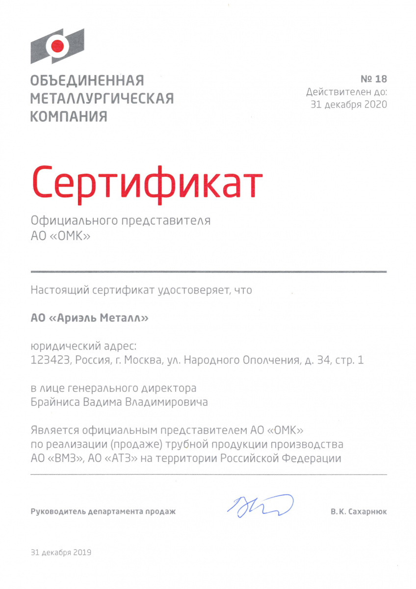 ОАО «Ариэль Металл» является региональным представителем ЗАО «ТОРГОВЫЙ ДОМ ТМК в Московской области
