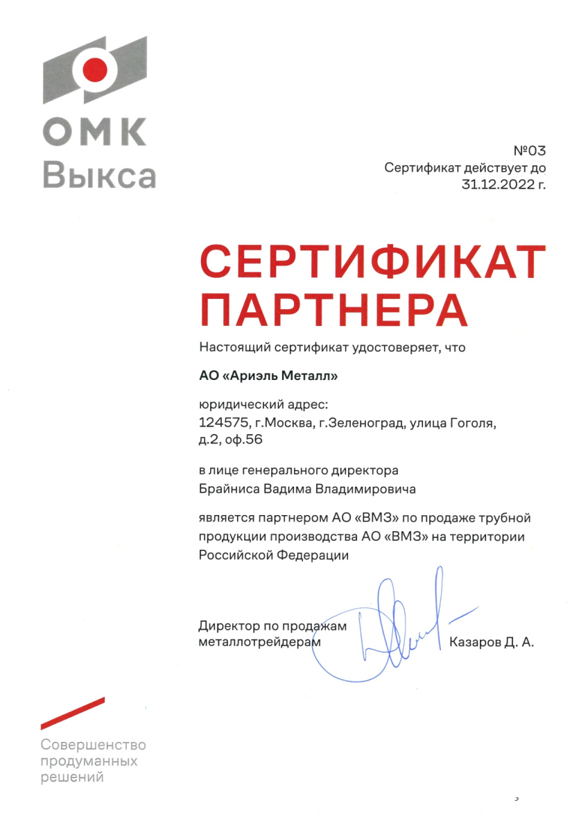 Сертификат партнера Публичного акционерного общества "Ашинский металлургический завод"