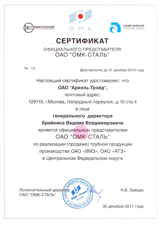 Официальный представитель ОАО «ОМК-СТАЛЬ» по реализации (продаже) трубной продукции производства ОАО ВМЗ и ОАО «АТЗ» в ЦФО 2012